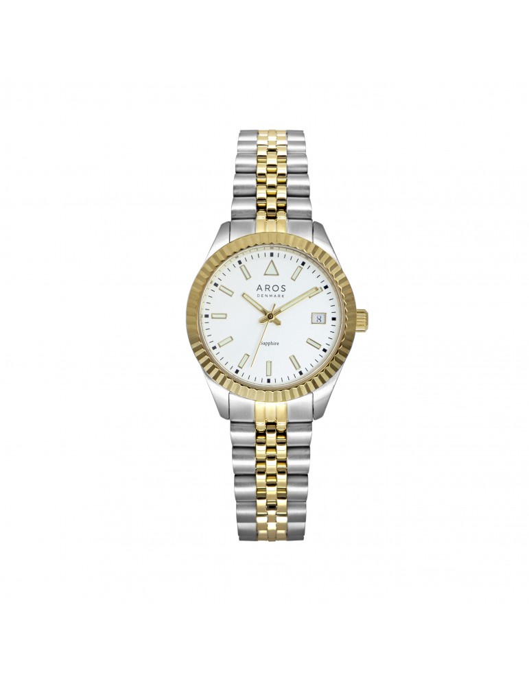 AROS dameur i stål med double på kasse og lænke. Uret har lys skive og dato.
