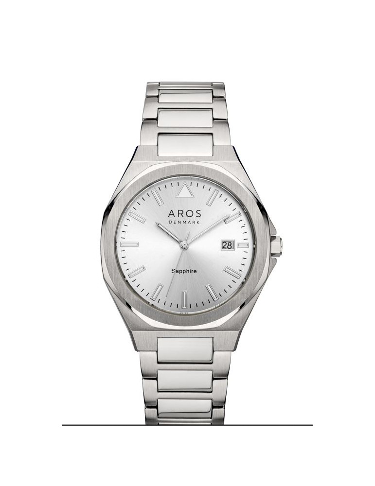 AROS herreur i stål - flot stilrent model med en lækkert afrundet urkasse, sølv urskive og sølvfarvet viser. Uret har dato.