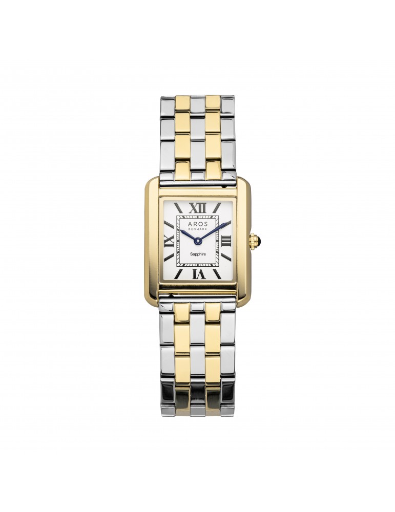Super fint og elegant dameur med stål bicolor lænke og double firkantet urkasse. Det er en flot stilren model med hvid urskive, romertal og sorte viser.