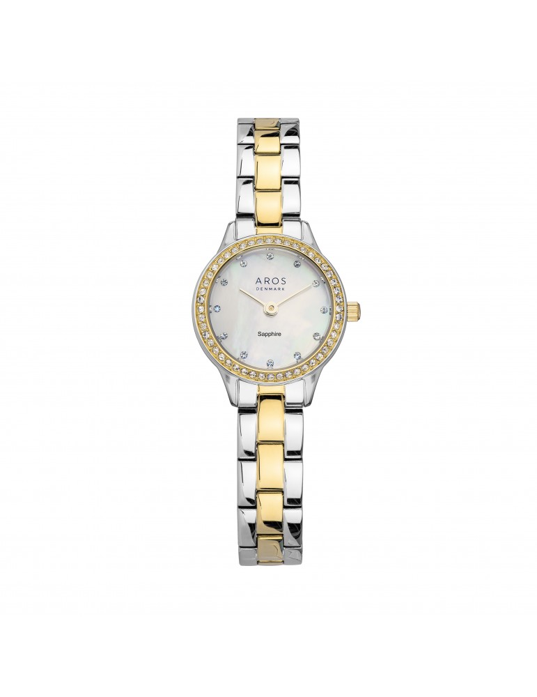Fint og feminint lille dameur med stål/bicolor lænke og sten på urkasse. Elegant model med perlemors skive og sten som index.