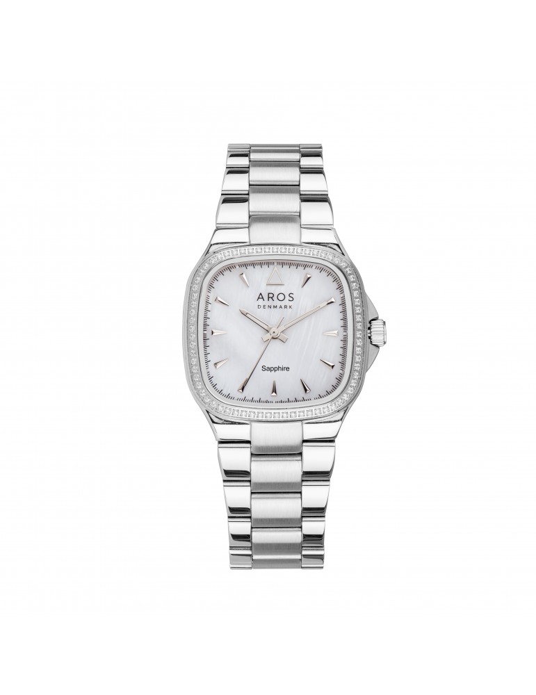 Sejt firkantet dameur med massiv stål lænke og sten på urkasse. Flot model med perlemors skive og sølvfarvet trekanter som index.