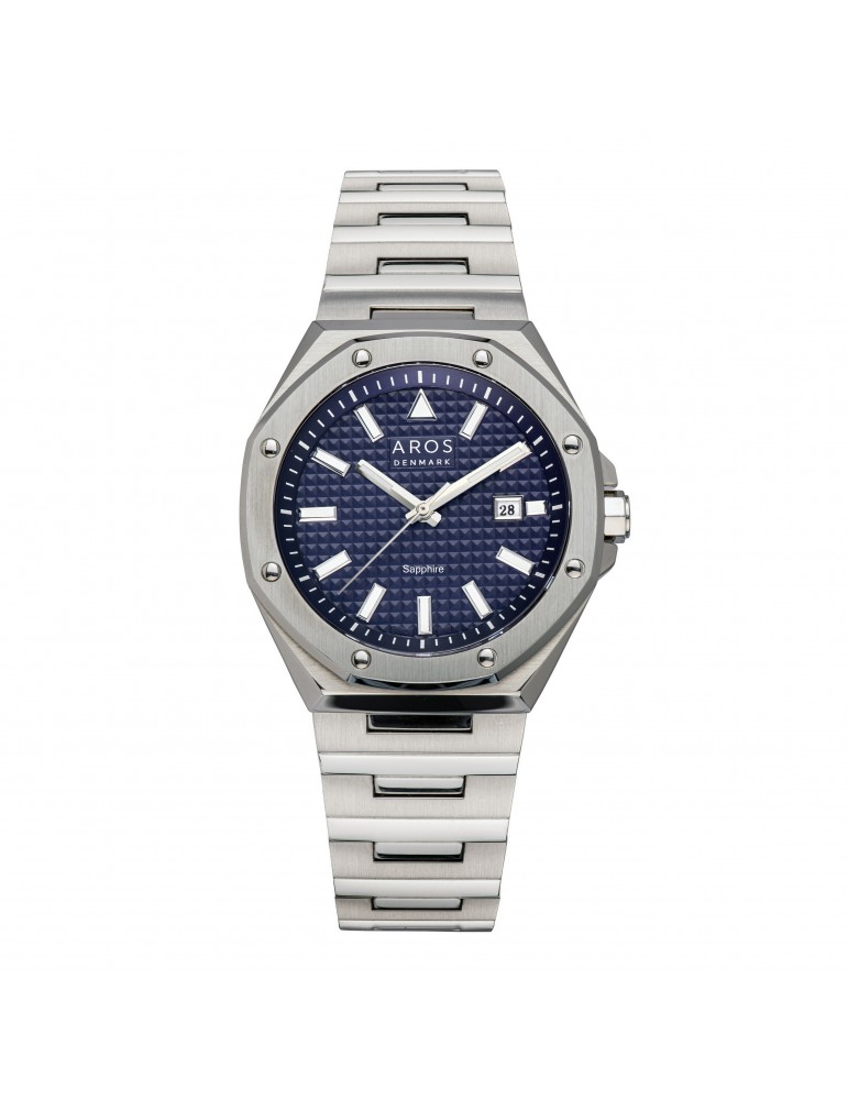 AROS herreur i stål - lækkert ur med massiv lænke, blå urskive, tydelige index og hvide viser. Uret har dato.
