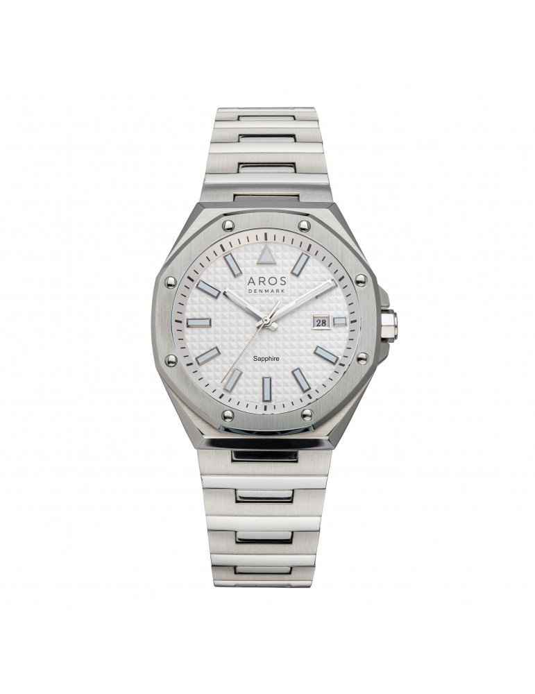 AROS herreur i stål - lækkert ur med massiv lænke, lys urskive, tydelige index og viser. Uret har dato.