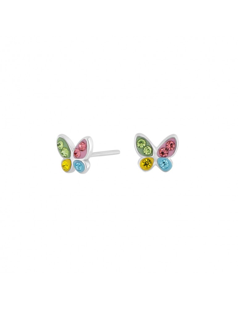 Fine små sølv sommerfugle ørestikker med lyserøde, blå, gule og grønne sten.
