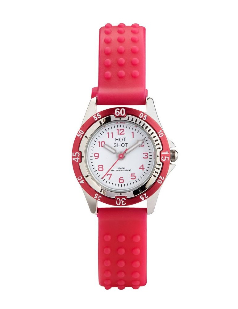 Fint Hot Shot Børneur i stål med flot rød urkrans og rød gummirem. Uret er vandtæt til 10 ATM