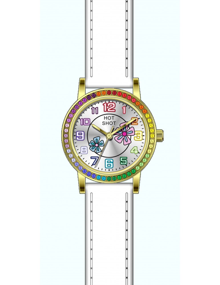 Smart Hot Shot Børneur med multifarvet sten og hvid rem. Skiven har tydelige tal i forskellige farver.