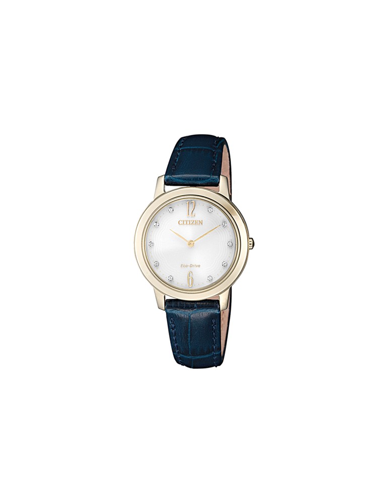 Citizen dameur i double med blå rem, lys skive med sten på index, og Eco-Drive som driver uret af solens energi.