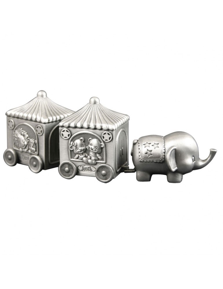 Lille elefant med 2 cirkusvogne i fortinnet, med teksten "Tooth" og "Curl".
