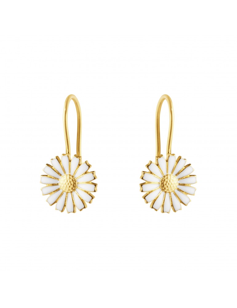 Den smukke marguerit - et evigt symbol på forår og optimisme - er her indfanget i sterlingsølv belagt med 18 karat guld med dens kronblade i hvid emalje i et par små og fine øreringe.