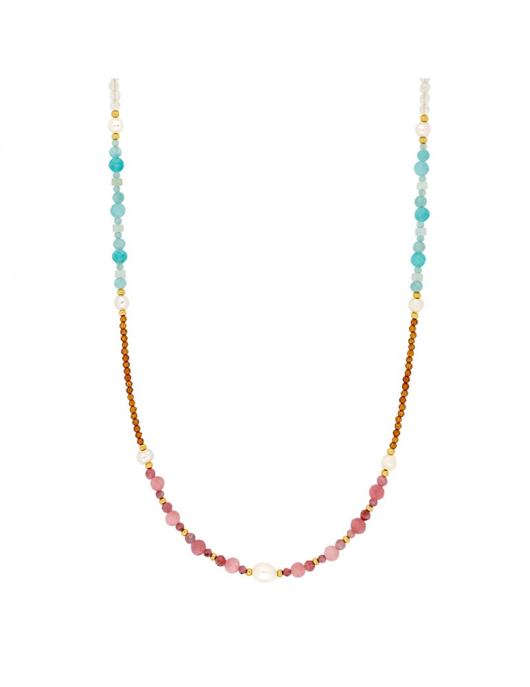 Sød halskæde med farvede sten i røde og blå farver og ferskvandsperler, samt forgyldte kugler i mellem.