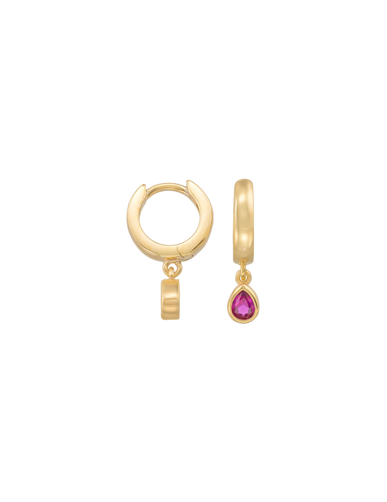 Jeweltime sølv forgyldte creoler med bevægelig rød zirkonia i dråbeform.