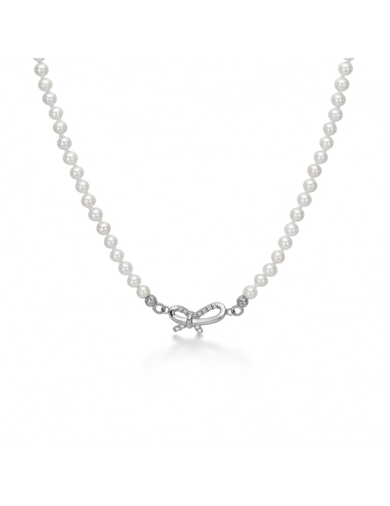 Smuk perlehalskæde med fint lille sløjfevedhæng i sølv med hvide topaser