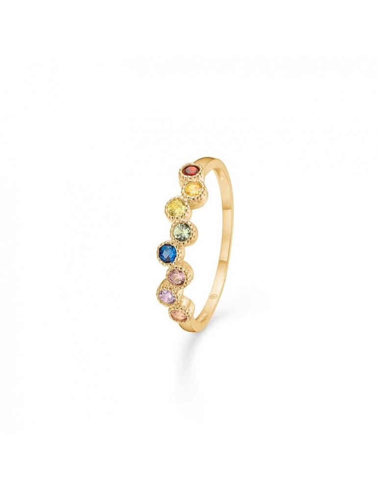 8kt guldring i fint design med zirkoner i forskellige farver.