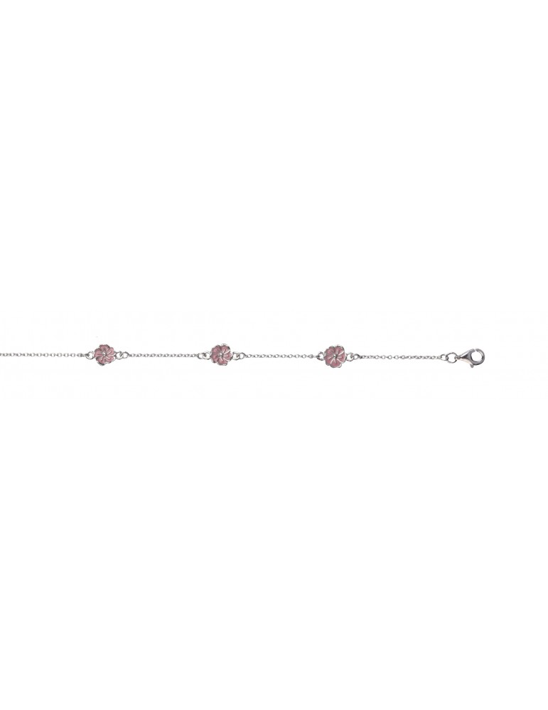 Super fint børnearmbånd i sølv med 3 lyserøde blomster.