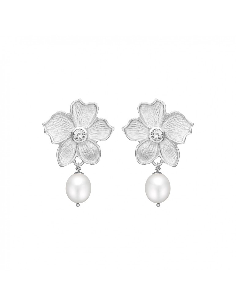 By Birdie - Super flotte øreringe i sølv, blomst- Poppy med perle og Zirrconia. Lidt anderledes stil end hvad man normalt ser fra Birdie.