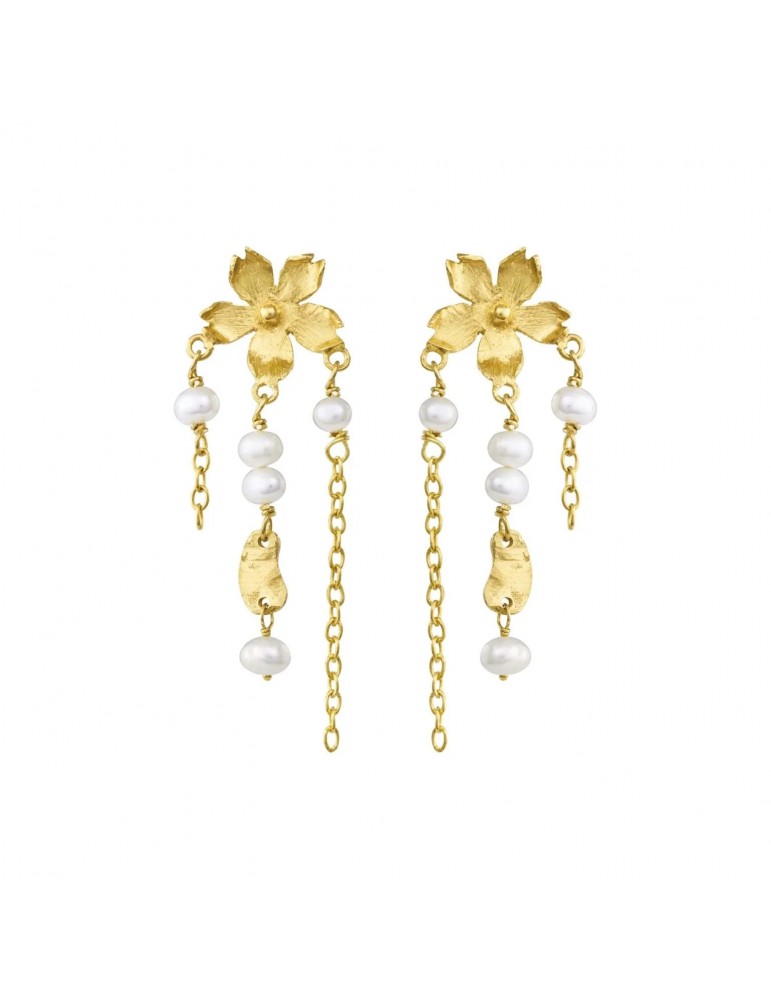 Super fine øreringe i forgyldt sølv, med kæde og hvide ferskvandsperler - samlet under en fin blomst
