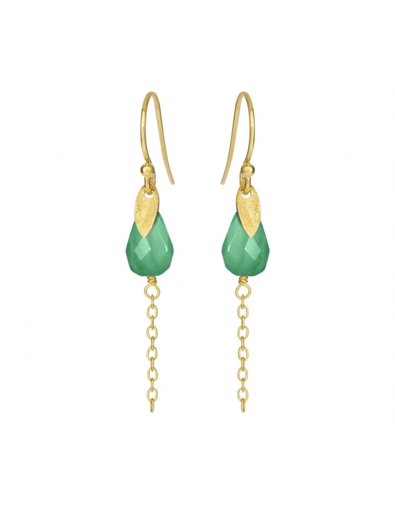Super fine øreringe i forgyldt sølv, med kæde, et lille blad og en facet dråbeformet aventurin