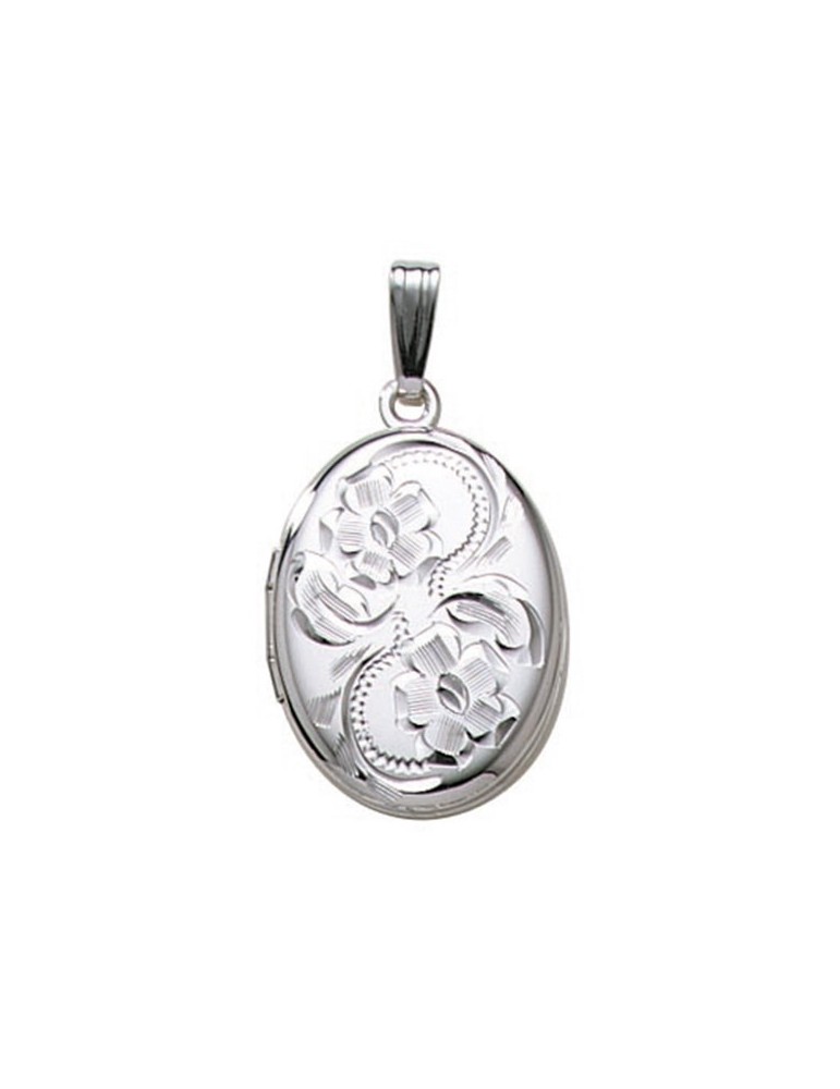Sølvmedaljon med flot blomstermønster.