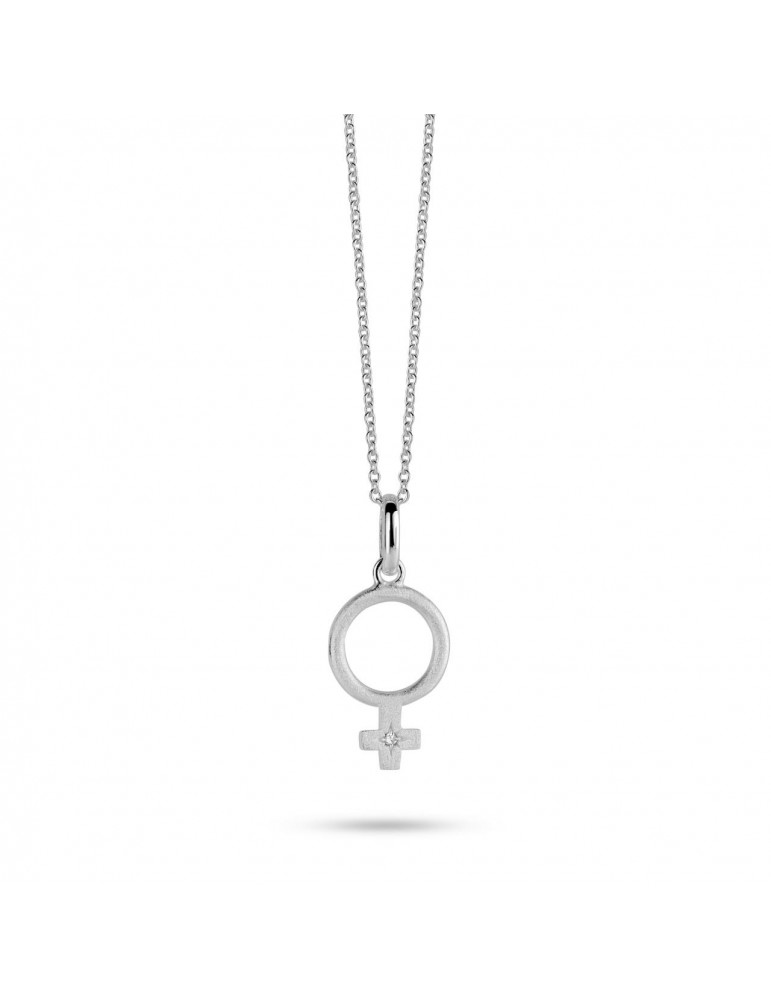 SHE halskæde i sterlingsølv. Halskædens vedhæng er designet som et kvindetegn, hvori der sidder en 0,01 CT W/VS diamant. Halskæden kan bæres med et par matchende SHE øreringe og tilhørende armbånd.