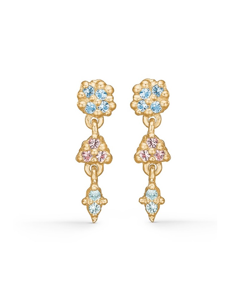 Super smukke og elegante ørehængere i forgyldt sølv med blå, grønne og rosa zirkonia.
