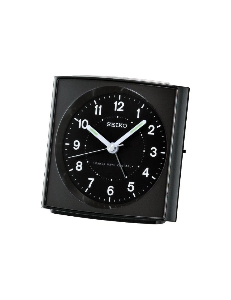 Radiostyret vækkeur fra Seiko i sort plast med sort skive med tydelige tal og visere.