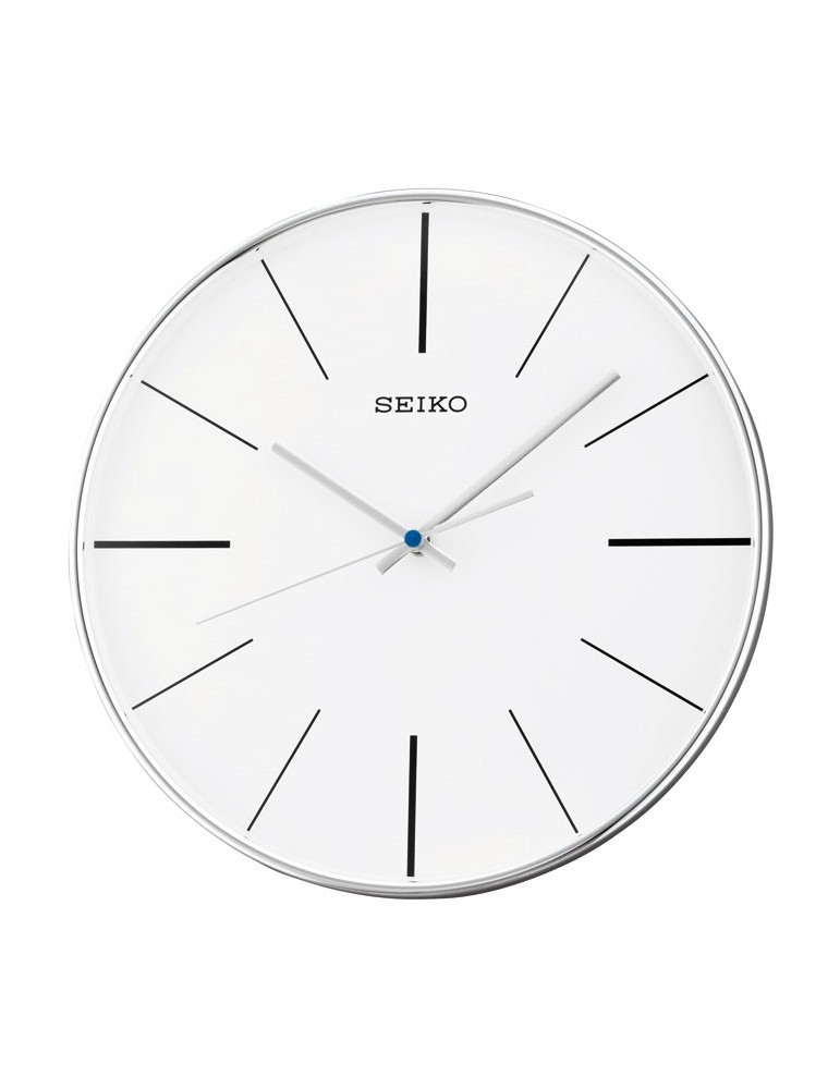 Vægur fra Seiko med sølvfarvet kant og hvid skive med sorte streger. Glidende sekundviser (lydløs).